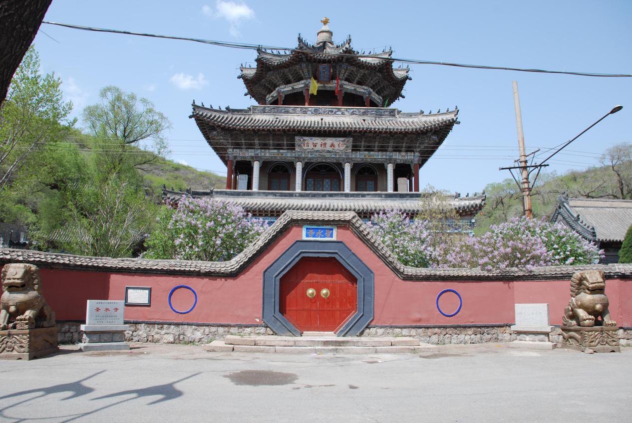 东西跨院:正殿及西配殿各三间,皆为硬 山式无梁殿,青砖砌筑的圆券顶,大部损坏。西跨院:正殿是小式硬山。西侧山脚是高台,顺二十一级踏跺上去有石窟、深四米,外部建门。院中卧一 石碑,字迹已模糊。莲花山圣水寺是儒、释、道三教合一的寺院。全院塑像129尊,楼亭 殿阁70余间。彩绘多用桃、柿子等图案,而且吸收南方造景的手法,利用地形经过精心处理,把坡地处理成不同高度的院落,形成不同的空间。巧借山景用来衬托古建筑,人造景和自然景相照应,收到了丰富视觉效果。这也 是官式建筑所没有的,为传统建筑中民间园林创作的佳作。被国家文物局古 建专家称为“中国古建筑的什锦小品”。圣水寺具有较高的历史价值和艺术价值,现是全国重点文物保护单位,著名旅游胜地。