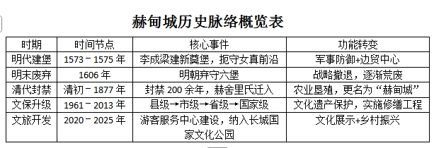 2020年,国家启动长城国家文化公园建设,全国重点文物保护单位长城--明长城--赫甸城城址游客服务中心建设及环境整治工程被确认为国家层面一般建设项目。目前,已完成全部工程项目,与此前竣工终验的赫甸城城址东城墙北城墙修缮工程形成互补,充分彰显了赫甸城城址的文化魅力和文旅融合发展的巨大潜力。赫甸城(原名新奠堡)是明代辽东长城防御体系“宽甸六堡”的核心组成部分,位于今辽宁省丹东市宽甸满族自治县青椅山镇赫甸村。其历史脉络可分为四个关键阶段: